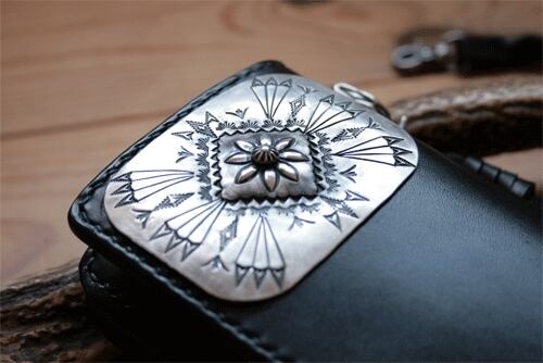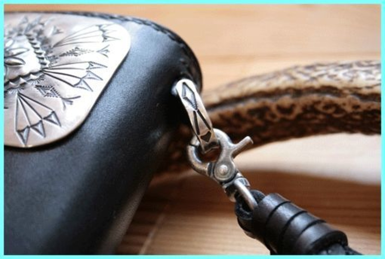 John Wallet #2は留め無しのシンプルなバイカーズウォレットにJohn Silverお気に入りのフェザーをモチーフとしたハンドメイドのシルバープレートを合わせたモデル、コインケースのコンチョ、ロープを留める為の金具もシルバー製
