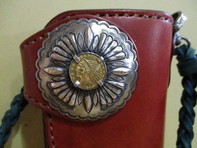John Wallet #4はシンプルなバイカーズウォレットのスタイルにハンドメイドφ55mmコンチョとゴールドコイン『インディアン・ヘッド金貨』をのせておりシルバーとベンズレザーとの調和を意識した◎プレミアムなチーフ★ウォレットになります!コインケースのコンチョ、ロープを留める為の金具もシルバー製のハンドメイドとなっております。本革の色は手染めのレッド・ブラウン色になります。